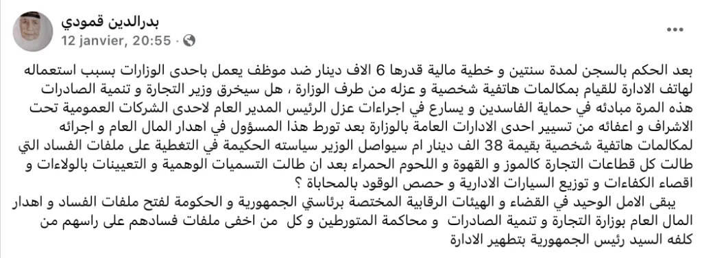 Dans sa publication, l’élu a rappelé le jugement récemment prononcé à l’encontre d’un fonctionnaire, condamné à deux ans de prison et à une amende de six mille dinars pour avoir utilisé un téléphone administratif à des fins personnelles, une faute ayant également conduit à sa révocation. Un verdict que Badreddine Gammoudi ne remet pas en cause sur le fond, mais qu’il inscrit dans une comparaison qu’il juge révélatrice, en regard d’autres dossiers, à ses yeux autrement plus graves, demeurés sans suites apparentes.
