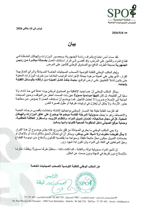 Le Syndicat des pharmaciens d’officine de Tunisie (Spot) a annoncé, dans un communiqué publié jeudi 15 janvier 2026, la reprise du travail selon le mécanisme du tiers payant avec la Caisse nationale d’assurance maladie (Cnam), à l’issue d’une réunion tenue la veille sous l’égide de la présidence de la République.
