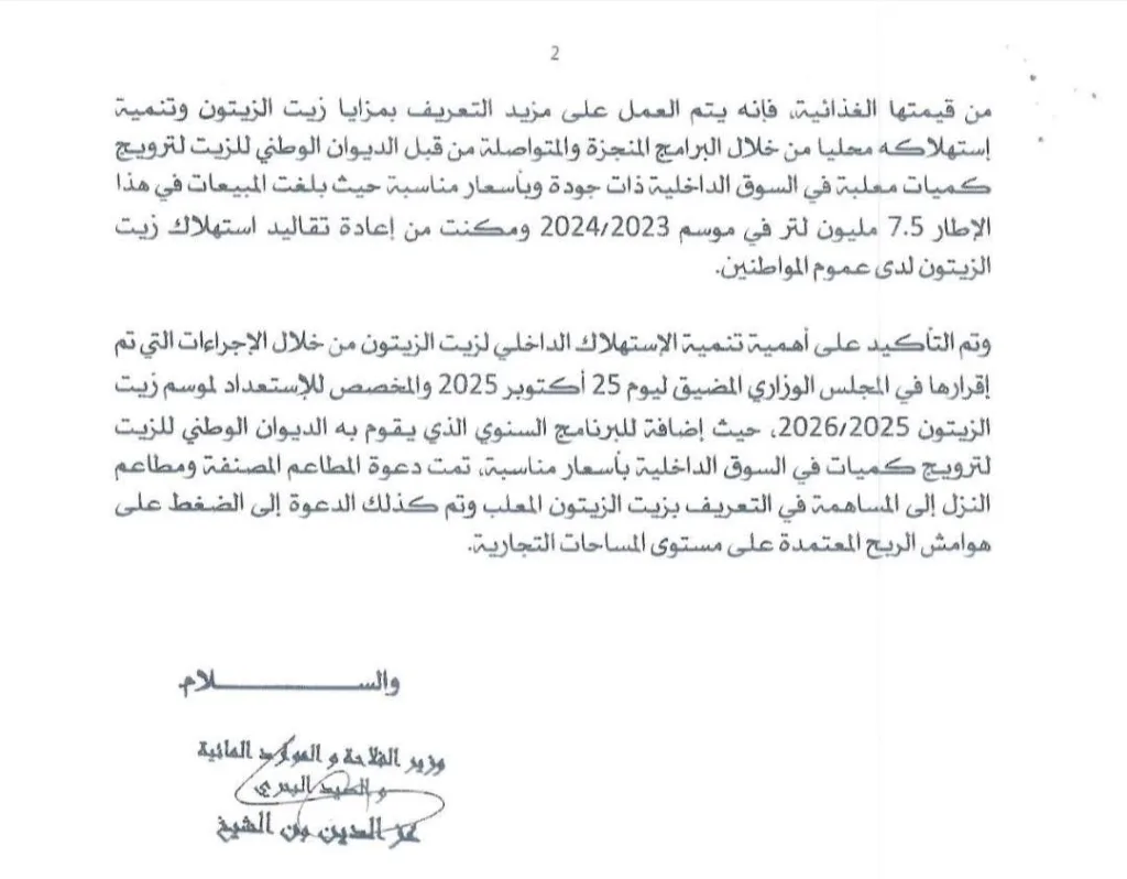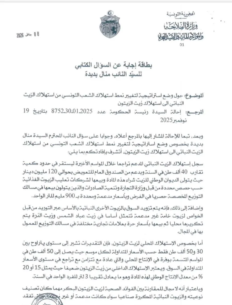 Face à ce constat, le ministère souligne la nécessité de promouvoir davantage l’huile d’olive, dont la valeur nutritionnelle et les bénéfices sanitaires sont largement supérieurs à ceux des huiles végétales raffinées, qu’elles soient subventionnées ou non. Des programmes de promotion sont menés de manière continue par l’Office national de l’huile afin de mettre à disposition du marché intérieur des quantités adaptées, de qualité et à des prix accessibles. Ces actions ont permis l’écoulement de 7,5 millions de litres au cours de la campagne 2023-2024, contribuant à la relance progressive des habitudes de consommation.