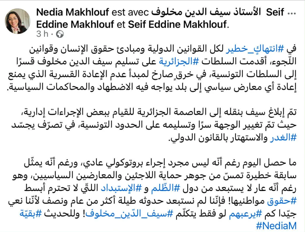 Nedia Makhlouf précise que « Seif a été informé qu’il serait transféré à Alger pour des formalités administratives », mais que sa destination a été modifiée en secret et qu’il a été remis aux autorités tunisiennes à la frontière. Elle dénonce un geste « de trahison et de mépris du droit international ».