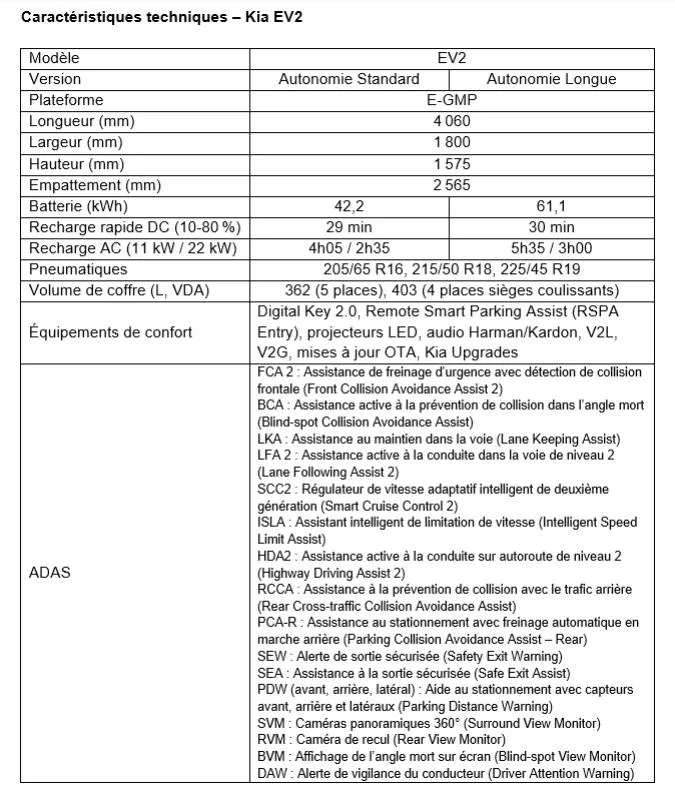 EV2 est proposé avec deux batteries : une version standard de 42,2 kWh et une version autonomie longue de 61 kWh. Les autonomies atteignent jusqu’à 317 km pour la version standard jusqu’à 448 km pour la version autonomie longue (données WLTP provisoires). Les deux versions reposent sur une architecture 400V et acceptent la recharge rapide DC 10-80% en environ trente minutes.