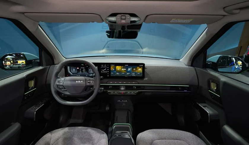 L’habitacle offre un espace ouvert et apaisant, inspiré du concept « Picnic Box », mêlant matériaux textiles et design intuitif. La planche de bord enveloppante renforce le confort et la sensation d’espace. EV2 propose le dernier système d’infodivertissement triple écran ccNC de Kia : combiné conducteur 12,3 pouces, écran de climatisation 5,3 pouces et écran central tactile 12,3 pouces. Les matériaux éco-responsables renforcent l’atmosphère moderne de l’intérieur.