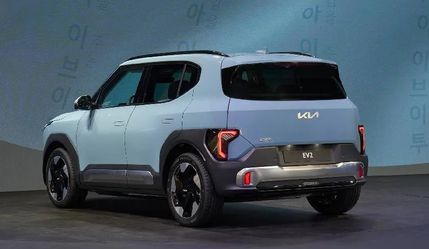 EV2 incarne la philosophie de design « Opposites United » (L’alliance des contraires) de Kia, avec des lignes verticales inspirées des autres modèles électriques de la marque, affirmant son allure de SUV. Long d’environ quatre mètres, il combine un gabarit compact à des proportions robustes, idéales pour l’environnement urbain. Les feux de jour verticaux, la nouvelle signature lumineuse « Star Map » (Constellation), une ceinture de caisse marquée et des passages de roues musclés créent un extérieur distinctif. Les jantes disponibles vont de seize à 19 pouces, avec un large choix de teintes de carrosserie disponibles. La version GT-Line renforce l’identité du modèle grâce à des éléments spécifiques : des inserts couleur carrosserie, des touches noir laqué sur le bouclier et la calandre, lui conférant ainsi une allure haut de gamme et un esprit baroudeur.