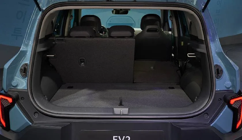 Un nouveau système de sièges arrière coulissants et inclinables maximise la flexibilité au quotidien. L’espace aux jambes à l’arrière varie de 0,88 m à 0,96 m, un record dans la catégorie. Lorsque les sièges sont avancés au maximum, EV2 offre jusqu’à 403 litres de volume de coffre, complétés par un frunk de quinze litres, également leader du segment. À titre de comparaison, le coffre est légèrement plus grand que celui d’une Ceed mesurant pourtant près de trente cm de plus. Le tout en conservant une garde au toit généreuse : 0,97 m en configuration cinq places, 0,97 m en version quatre places.