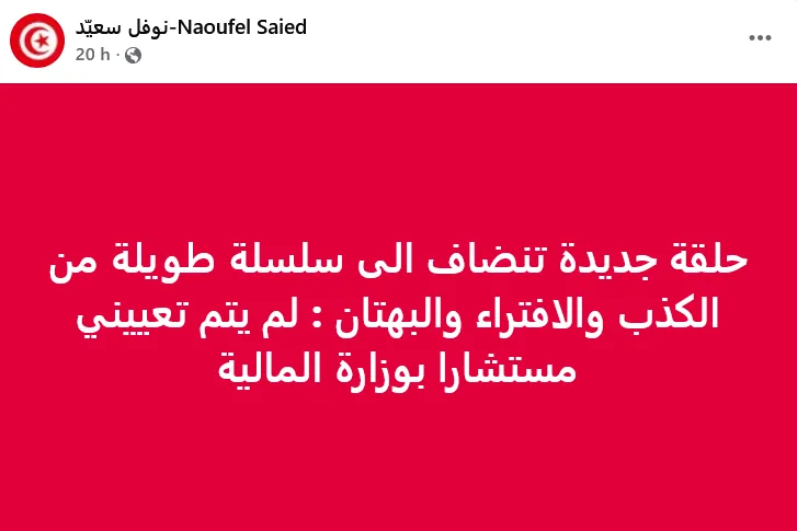 Face à l’ampleur prise par cette information non vérifiée, Naoufel Saïed est sorti de son silence. Dimanche 18 janvier 2026, il a publié un démenti catégorique sur sa page Facebook, restée inactive depuis octobre 2025. Il y écrit en arabe : « Un nouvel épisode s’ajoute à une longue série de mensonges, de calomnies et de diffamations : je n’ai pas été nommé conseiller au ministère des Finances ».