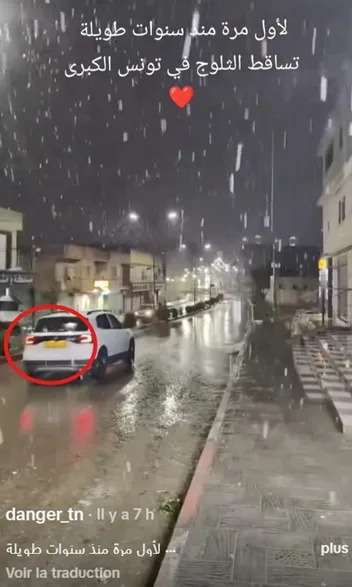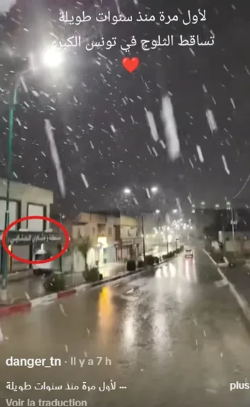 Sur TikTok, une vidéo circule montrant une scène présentée comme exceptionnelle : on y voit des flocons de neige tomber au milieu d’une rue, accompagnés de la description suivante : « Pour la première fois depuis de longues années, de la neige tombe sur le Grand Tunis ».