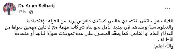 Dans son analyse, Aram Belhadj met également l’accent sur les conséquences concrètes de cette non-participation en matière de coopération économique. Selon lui, l’absence à Davos réduit les chances de nouer des partenariats stratégiques avec des acteurs économiques majeurs, aussi bien publics que privés, dans un contexte mondial où la concurrence entre pays pour attirer capitaux et projets est de plus en plus intense.