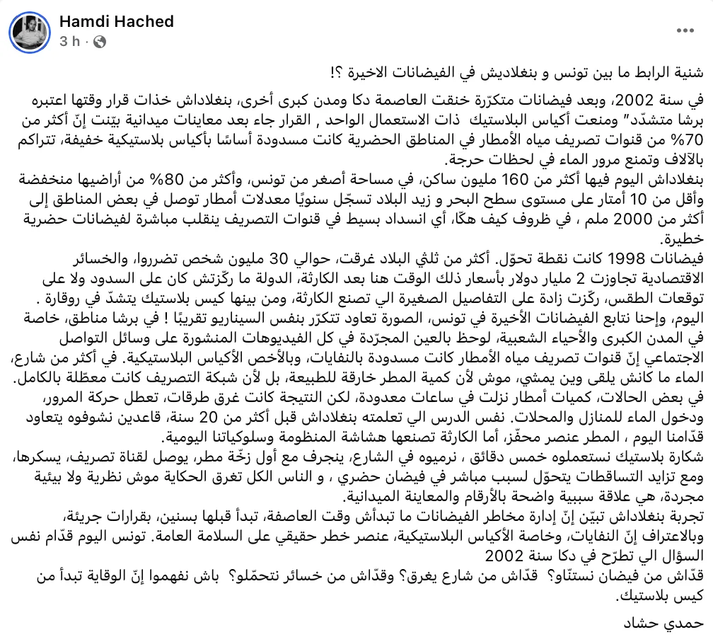 « La Tunisie se trouve aujourd’hui face à la même interrogation que Dacca au début des années 2000 : combien d’inondations faudra-t-il encore subir, combien de rues devront être submergées et combien de pertes économiques devront être enregistrées pour admettre que la prévention commence parfois par un geste simple — et un objet en apparence anodin — le sac plastique », a-t-il dénoncé.