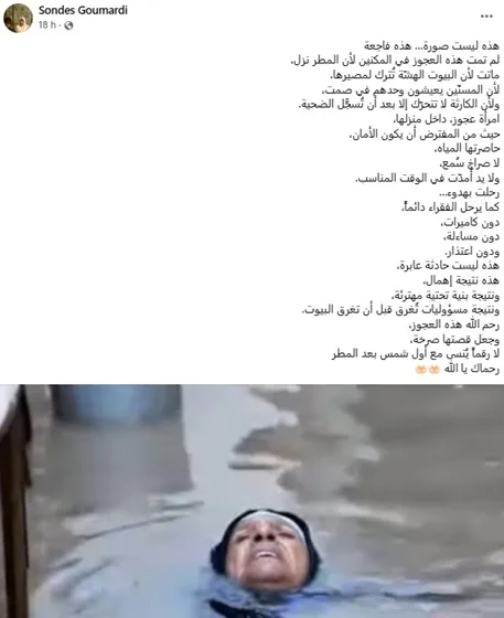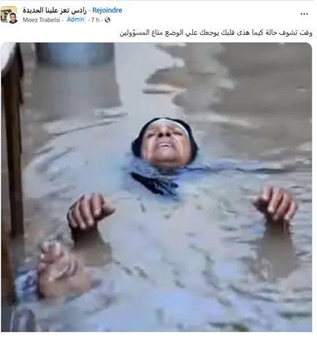 Au moment où la Tunisie faisait face à de violentes inondations ayant causé des pertes humaines et d’importants dégâts matériels, une photo particulièrement choquante a largement circulé sur Facebook. On y voit une femme, visiblement en détresse, semblant se noyer dans des eaux boueuses. L’image, accompagnée de messages alarmistes et émotionnels, a suscité une vague d’indignation, de tristesse et de colère parmi les internautes, beaucoup y voyant la preuve visuelle de la gravité de la situation et de l’abandon des victimes.
