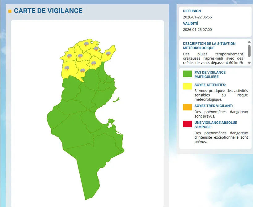 Le jaune, correspondant à un niveau de vigilance ordinaire, a été attribué aux gouvernorats du Grand Tunis, de Nabeul, Zaghouan, Bizerte, Béja, Jendouba, Le Kef et Siliana. En revanche, le vert — indiquant l’absence d’alerte météorologique — concerne le reste des gouvernorats du pays.