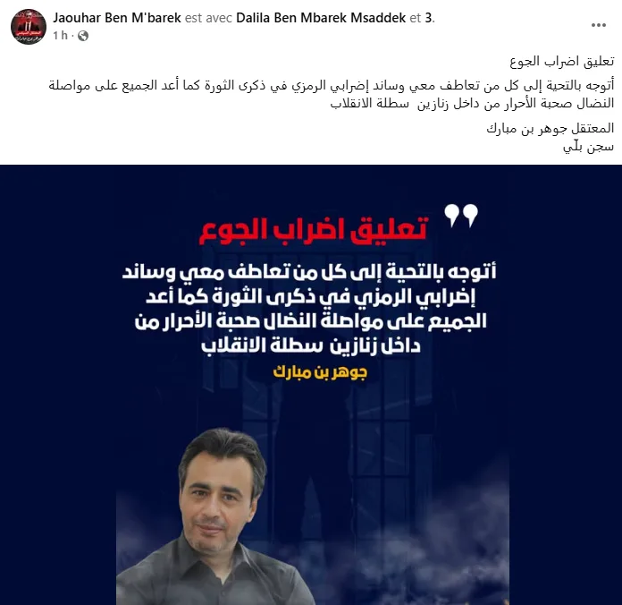 Le détenu politique Jaouhar Ben Mbarek a annoncé, dimanche 25 janvier 2026, la suspension de la grève de la faim symbolique qu’il avait entamée à l’occasion de l’anniversaire de la Révolution tunisienne. Dans un message diffusé sur les réseaux sociaux par ses proches, il a adressé ses salutations et ses remerciements à toutes les personnes qui ont exprimé leur solidarité et soutenu son mouvement de protestation.