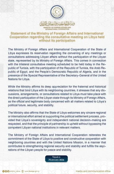 Le ministère libyen des Affaires étrangères et de la Coopération internationale, relevant du gouvernement d’unité nationale, a exprimé, dans un communiqué publié dimanche 25 janvier 2026 , ses réserves quant à la tenue de toute réunion ou consultation portant sur la question libyenne sans la participation officielle de l’État libyen.