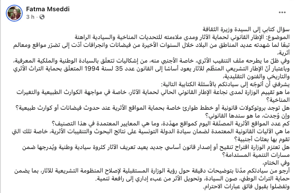 La députée Fatma Mseddi a adressé une correspondance officielle au ministère des Affaires culturelles, qu’elle a rendue publique sur sa page Facebook le lundi 26 janvier 2026, attirant l’attention sur les fragilités juridiques entourant la protection du patrimoine archéologique tunisien face aux défis climatiques et aux enjeux de souveraineté nationale.