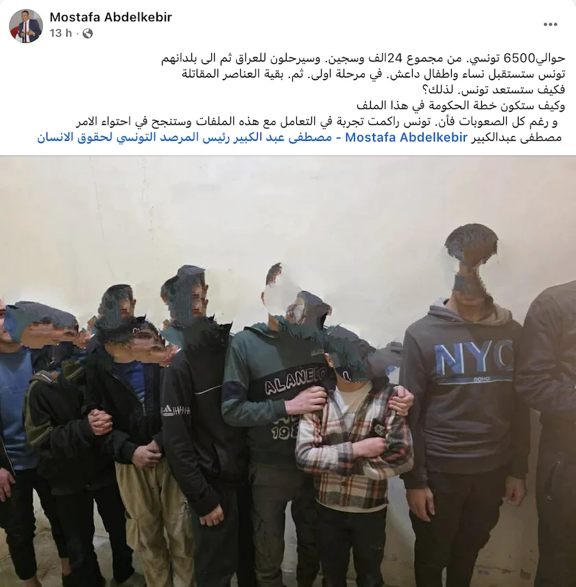 Dans une publication sur sa page Facebook, il a indiqué également que la Tunisie accueillerait, dans une première phase, les femmes et les enfants de nationalité tunisienne liés à Daech, puis, ultérieurement, le reste des combattants.