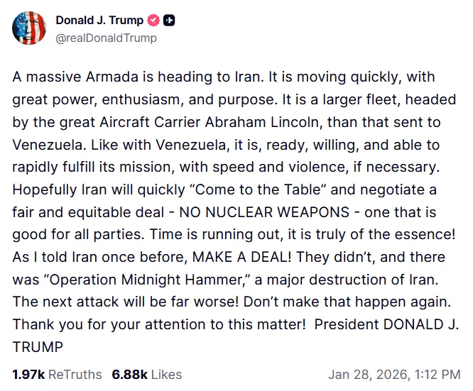 Au-delà de l’annonce du déploiement militaire, un message publié mercredi 28 janvier par le président américain Donald Trump prend la forme d’un ultimatum explicite adressé aux autorités iraniennes. Le chef de la Maison-Blanche y exhorte Téhéran à « venir rapidement à la table des négociations » afin de conclure ce qu’il qualifie de « deal juste et équitable », martelant une ligne rouge non négociable : l’absence totale d’armes nucléaires.