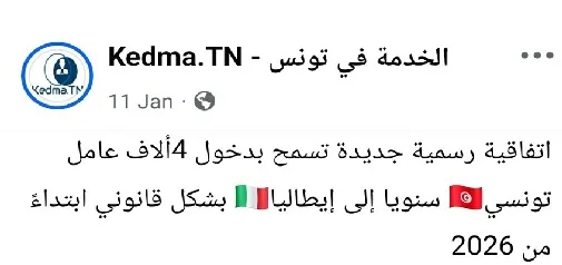 Des publications virales sur les réseaux sociaux et des messages circulant sur des forums communautaires prétendent que la Tunisie et l’Italie ont signé un accord officiel ouvrant droit à 4.000 contrats de travail non saisonniers chaque année pour des ressortissants tunisiens, souvent présenté comme un « accord historique » déjà en vigueur.