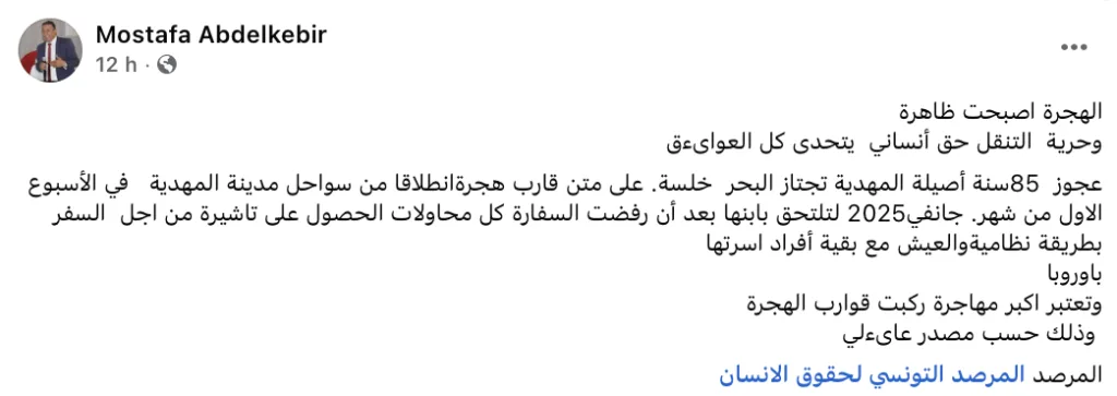 Selon la publication de Mustapha Abdelkebir jeudi 29 janvier 2026 sur les réseaux sociaux, cette nonagénaire aurait tenté en vain d’obtenir un visa pour voyager légalement et vivre auprès de sa famille. Après avoir essuyé tous les refus des instances consulaires, elle a choisi la voie de l’illégalité, devenant ainsi la plus âgée des migrantes ayant emprunté les routes de la mort.