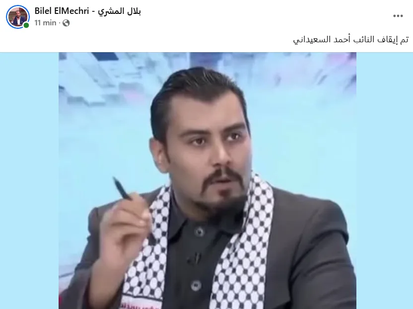 Le député Bilel El Mechri a annoncé, dans une publication sur les réseaux sociaux ce mercredi 4 février 2026, l’arrestation de son collègue parlementaire Ahmed Saidani.