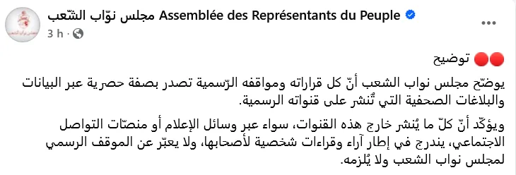 Le communiqué précise : « L’Assemblée des représentants du peuple précise que toutes ses décisions et positions officielles sont publiées exclusivement à travers les communiqués et déclarations de presse diffusés sur ses canaux officiels.