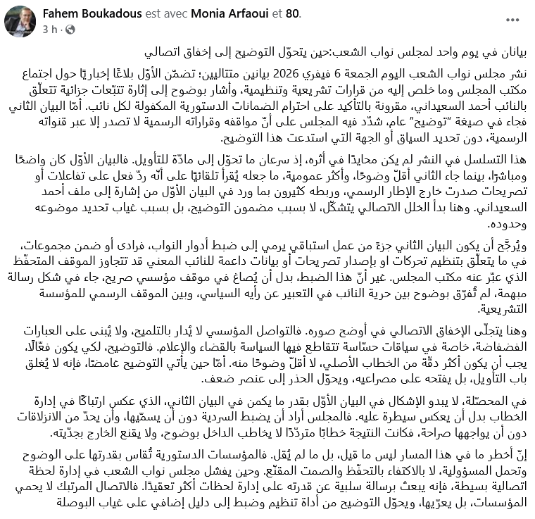 En conclusion, Fahem Boukadous estime que l’aspect le plus préoccupant n’est pas ce qui a été dit, mais ce qui n’a pas été dit : dans une séquence politique sensible, la capacité des institutions à assumer la clarté et la responsabilité constitue un indicateur de leur solidité. Or, selon lui, l’ARP a donné l’image d’une institution incapable de gérer une « simple » séquence de communication, ce qui interroge sur sa capacité à affronter des moments plus complexes.