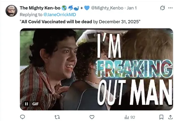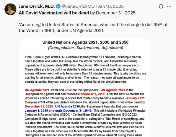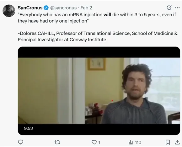 Parmi les messages qui refont surface, on retrouve notamment un tweet largement partagé à l’époque affirmant : « Toutes les personnes vaccinées contre le Covid seront mortes d’ici le 31 décembre 2025 ». D’autres internautes repartagent également des vidéos anciennes, dont une citation attribuée à la scientifique Delores Cahill déclarant : « Toute personne ayant reçu une injection à ARN messager mourra dans un délai de trois à cinq ans, même après une seule dose ».
