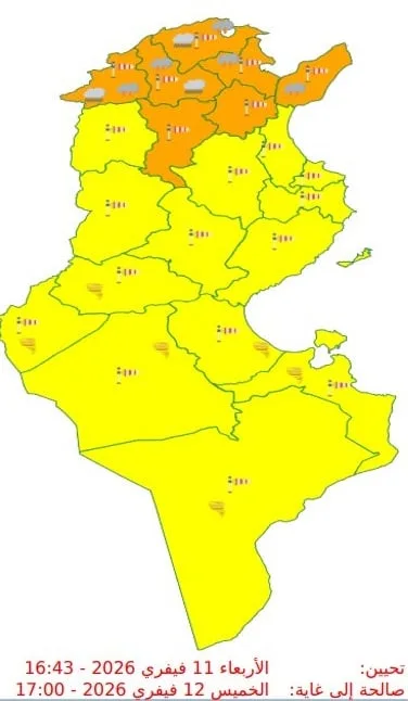 Les gouvernorats de Jendouba, Siliana, Béja, Bizerte, La Manouba, Ariana, Tunis, Ben Arous, Zaghouan et Nabeul ont été placés en vigilance orange, en raison du niveau de risque lié aux conditions météorologiques prévues.