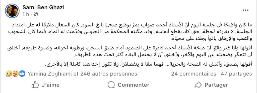 L’avocat Sami Ben Ghazi a exprimé, dans une publication rendue publique sur Facebook jeudi 12 février 2026, de vives inquiétudes quant à l’état de santé de son client, Ahmed Souab, à l’issue de la dernière audience.