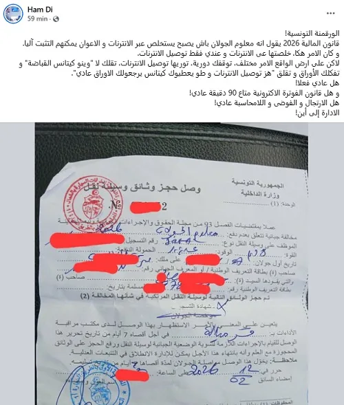 Dans ce témoignage largement partagé sur les réseaux sociaux, l’internaute affirme avoir réglé sa taxe de circulation en ligne, conformément aux dispositions de la loi de finances 2026 et de l’arrêté conjoint publié au Jort n°151. Pourtant, lors d’un contrôle routier, il explique s’être vu réclamer un reçu émis par la recette des finances, malgré la présentation du justificatif électronique de paiement.