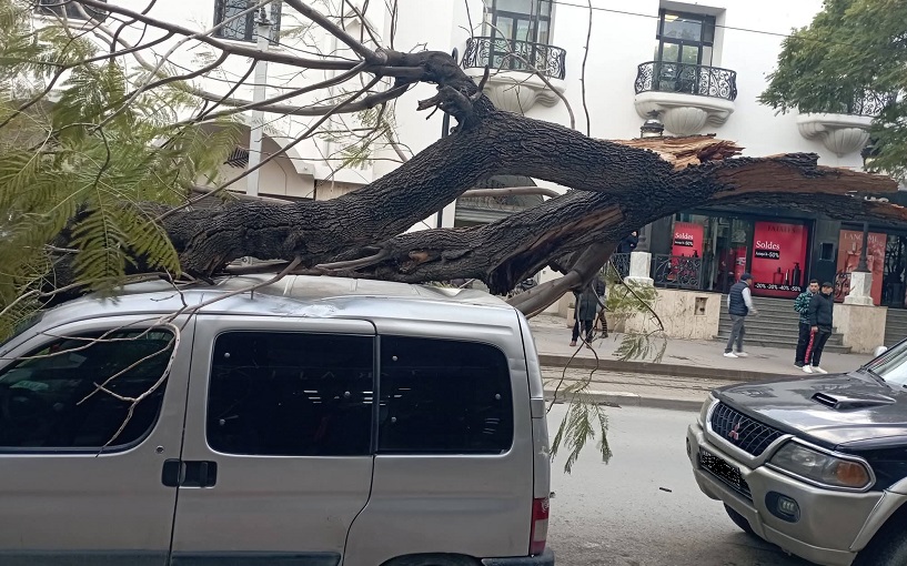 Les fortes rafales enregistrées ce jeudi 12 février 2026 ont provoqué la chute de nombreux arbres et grosses branches dans plusieurs zones, entraînant des perturbations de la circulation et nécessitant l’intervention des équipes de la Protection civile pour sécuriser les axes routiers et dégager les obstacles.