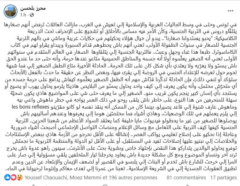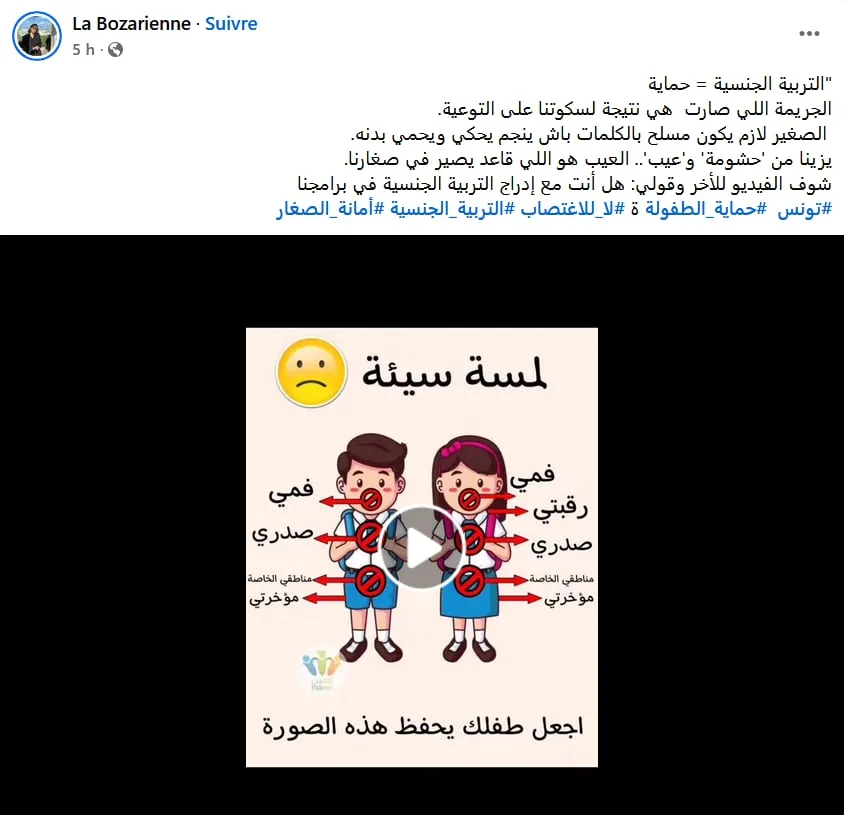 « Aujourd’hui, dans le monde entier, l’éducation sexuelle fait partie des programmes scolaires, alors pourquoi pas en Tunisie ? ». Il souligne que l’éducation sexuelle ne consiste pas à exposer les enfants à des contenus inappropriés, mais à leur apprendre le respect de leur corps et des autres :