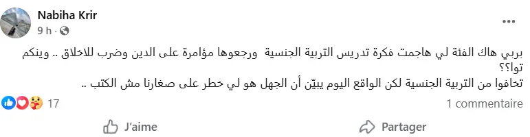 D’autres internautes relèvent la persistance des résistances culturelles. Selon Nabiha Krir, certaines familles continuent de voir l’éducation sexuelle comme une menace pour les valeurs ou la morale : « On a peur de l’éducation sexuelle, mais la réalité montre que l’ignorance est ce qui met nos enfants en danger, pas les livres ».