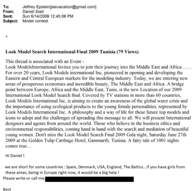 Les documents font également apparaître le nom de Daniel Amar Siad, recruteur international dans le secteur du mannequinat, identifié aussi sous les variantes Amar Siad ou Siad Amar. Les pièces judiciaires le décrivent comme ayant joué un rôle de recruteur pour Epstein au sein d’un réseau transnational de repérage de jeunes femmes via des événements de mode. Les échanges consultés montrent qu’il transmettait des informations sur certains concours, dont celui organisé à Tunis, sans que cela n’établisse l’existence d’activités criminelles menées sur le territoire tunisien.