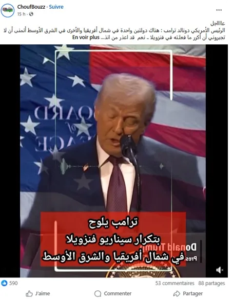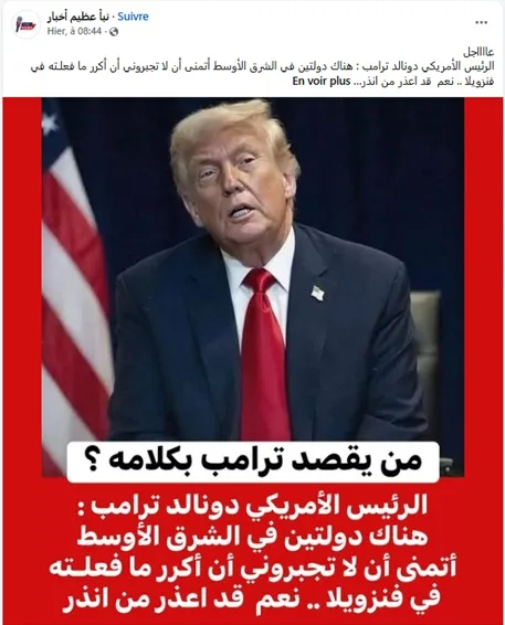 Depuis plusieurs jours, des publications relayées sur différentes pages Facebook affirment que le président américain Donald Trump aurait déclaré : « Il y a deux pays, l’un en Afrique du Nord et l’autre au Moyen-Orient que j’espère ne pas être obligé de traiter comme je l’ai fait avec le Venezuela ». Ces messages, largement partagés, ont suscité de nombreuses réactions d’internautes, certains tentant d’identifier les pays visés, d’autres dénonçant une menace géopolitique majeure.