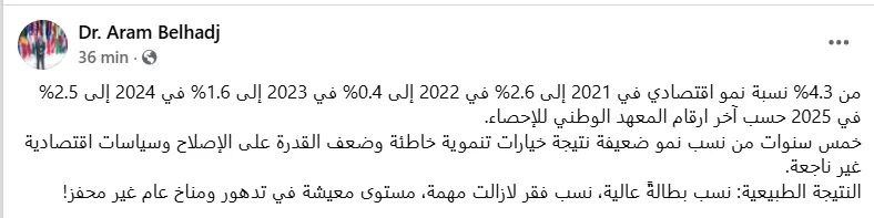 Pour Aram Belhadj, ces performances traduisent « cinq années de faibles taux de croissance », qu’il attribue notamment à « des choix de développement erronés, une faible capacité de réforme et des politiques économiques inefficaces ».