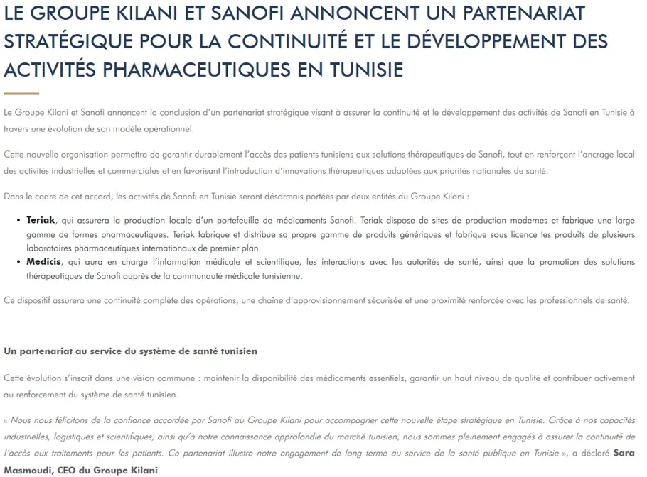 En parallèle, d’autres éléments viennent nuancer l’hypothèse d’un retrait total du laboratoire du marché tunisien. Nous avons identifié une annonce relative à un accord conclu avec le Groupe Kilani. Ce partenariat prévoit la reprise opérationnelle de certaines activités de Sanofi au niveau local. Dans ce cadre, la production d’une partie du portefeuille de médicaments serait assurée en Tunisie par Teriak, tandis que MEDICIS S.A.R.L se chargerait de l’information médicale, des relations avec les autorités sanitaires et de la promotion scientifique auprès des professionnels de santé. Cet accord s’inscrit, selon ses promoteurs, dans une logique de continuité de l’accès aux traitements et de soutien au système de santé national, plutôt que dans une logique de départ brutal.