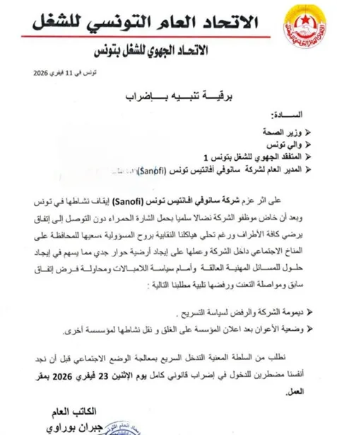 La polémique a pris de l’ampleur après l’intervention de structures syndicales. Dans un communiqué publié le 12 février 2026, l’Union générale tunisienne du travail (UGTT) a confirmé que la filiale Sanofi Aventis Tunisie envisagerait effectivement l’arrêt de ses activités en Tunisie. Selon la centrale syndicale, cette intention de fermeture intervient après une période de tensions sociales durant laquelle les employés avaient mené des actions de protestation pacifiques, notamment en portant le brassard rouge, sans parvenir à un accord avec la direction.