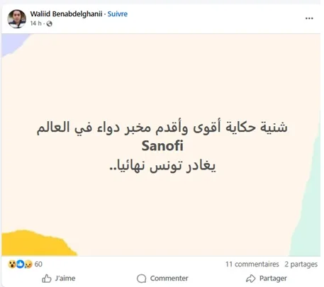 Depuis plusieurs jours, des publications virales sur Facebook affirment que le laboratoire pharmaceutique Sanofi aurait décidé de quitter la Tunisie. L’information, massivement relayée, a suscité une vive inquiétude dans l’opinion publique et parmi les professionnels de la santé, alimentant des interrogations sur l’avenir de l’approvisionnement en médicaments et sur l’attractivité du pays pour les investisseurs du secteur.