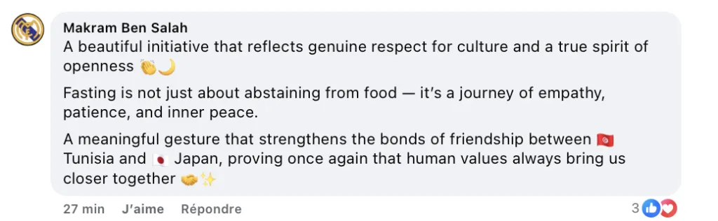 Un internaute a rappelé un précédent similaire : « Il y avait déjà un Japonais qui jeûnait avec nous parmi ceux venus avec la JICA au Centre de recherche scientifique de Borj Sedria, dans un noble geste de respect envers les collègues tunisiens durant le mois sacré. »