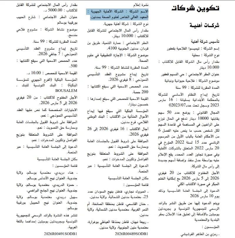 Dans le Journal officiel de la République tunisienne (Jort) n°22 du 20 février 2026, la création d’une entreprise communautaire a été annoncée : l’Institut supérieur privé des sciences de la santé à Médenine. L’annonce, publiée dans les rubriques juridiques et légales, précise les modalités de constitution de la société mais suscite de vives interrogations, tant sur le plan administratif que sur celui de la sécurité sanitaire et éducative.