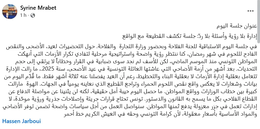 Elle a regretté l’absence d’une stratégie claire pour anticiper les besoins, alors que l’Aïd El Kebir est dans environ trois mois et que les tensions sur la viande rouge persistent.