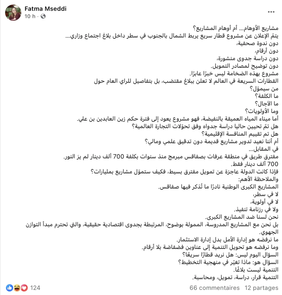 La députée Fatma Mseddi a exprimé ses réserves quant à l’annonce récente d’un train à grande vitesse reliant le nord et le sud du pays. Dans un statut publié sur Facebook dans la soirée de jeudi 26 février 2026, elle a déploré qu’un projet d’une telle ampleur avait été évoqué « en une seule ligne dans un communiqué d’un conseil ministériel… sans conférence de presse, sans chiffres, sans étude de faisabilité publiée, sans précision sur les sources de financement ».
