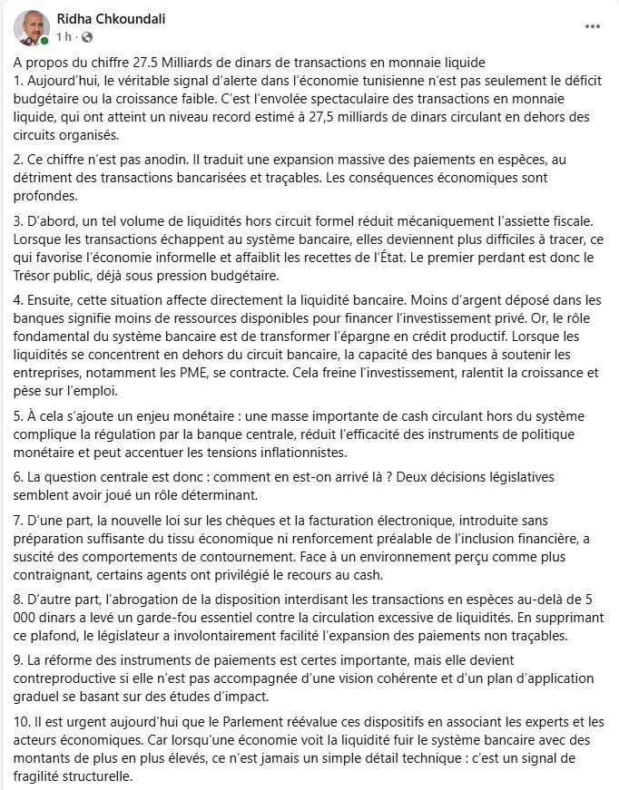 Le montant des billets et pièces en circulation en Tunisie a atteint un niveau jamais vu : 27,5 milliards de dinars. Face à cette flambée historique, Ridha Chkoundali, professeur universitaire d’économie, tire la sonnette d’alarme. Dans un post publié vendredi 27 février 2026 sur sa page Facebook, il décrit un phénomène qui dépasse les simples chiffres : « Le véritable signal d’alerte dans l’économie tunisienne n’est pas seulement le déficit budgétaire ou la croissance faible, mais l’envolée spectaculaire des transactions en monnaie liquide ». Pour lui, cette fuite massive de liquidités hors des circuits bancaires constitue un signal de fragilité structurelle et menace la stabilité financière du pays.
