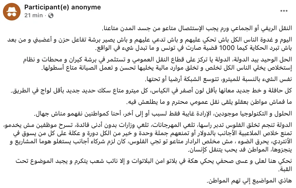 « Le transport rural ou collectif est un véritable fléau qu’il faut extirper du corps de nos villes. Aujourd’hui, demain, chacun parlera d’eux, chacun les dénoncera, et l’indignation suscitera beaucoup d’émotion et de colère. Puis, comme dans mille autres affaires survenues en Tunisie, l’affaire retombera dans l’oubli, sans que rien ne change réellement », a affirmé un autre internaute.