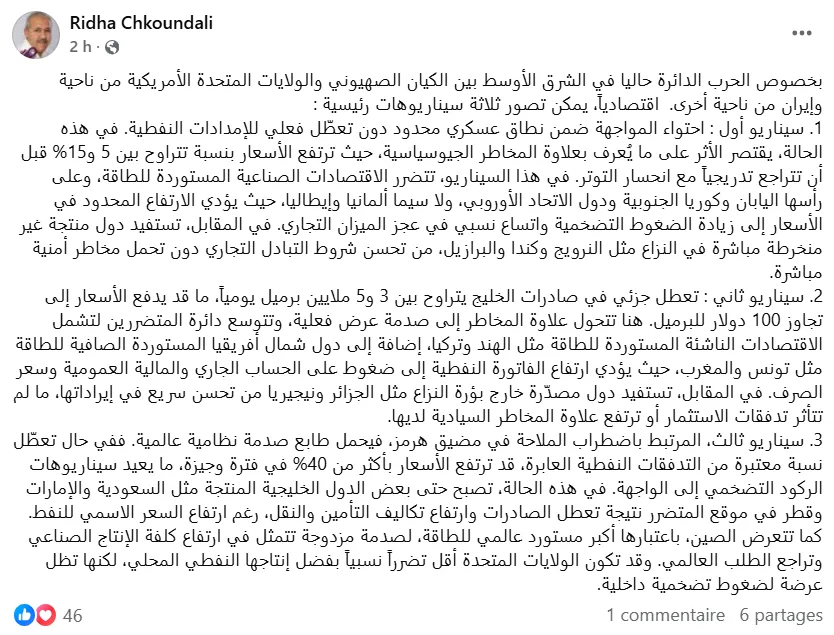Alors que les tensions militaires s’intensifient au Moyen-Orient, l’économiste Ridha Chkoundali a publié une analyse détaillée des répercussions économiques possibles de l’escalade opposant les États-Unis et Israël à l’Iran. Dans une publication, dimanche 1er mars 2026, il identifie trois scénarios principaux, allant d’un impact limité sur les marchés à une crise énergétique mondiale susceptible d’entraîner un choc économique majeur, notamment pour les pays importateurs nets d’énergie comme la Tunisie.