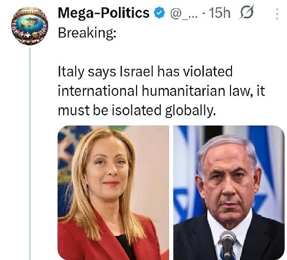 Ainsi, l’affirmation relayée par le compte Mega News selon laquelle l’Italie aurait déclaré qu’Israël « doit être isolé mondialement » est trompeuse. Giorgia Meloni ne s’est pas prononcée publiquement en ces termes sur les frappes actuelles contre l’Iran. Ses déclarations documentées concernent principalement la situation à Gaza, avec des appels au respect du droit international humanitaire et à une solution politique, mais sans demande d’isolement global ni usage du terme de génocide dans un cadre officiel.