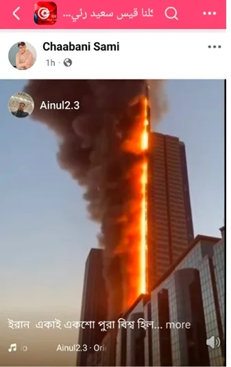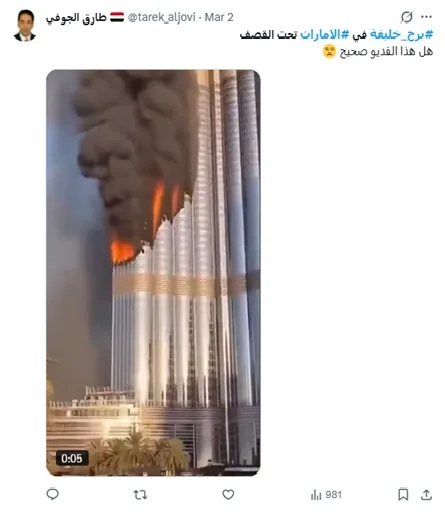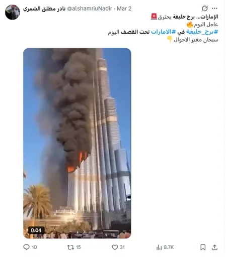 Plusieurs séquences ont ainsi circulé. L’une d’elles montre un gratte-ciel en flammes et est accompagnée d’une description affirmant qu’il s’agirait d’un bombardement iranien à Dubaï. Une autre vidéo, tout aussi virale, prétend montrer une attaque près de la célèbre tour Burj Khalifa, avec d’importants incendies et des explosions qui toucheraient des voitures et des bâtiments aux alentours.