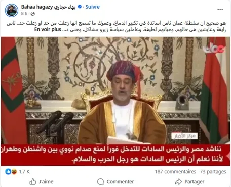 Dans le même contexte, une autre vidéo largement diffusée montre le sultan d’Oman, Haitham ben Tariq, prononçant ce qui semble être un discours officiel. Selon la narration qui accompagne la séquence, il appellerait l’ancien président égyptien à intervenir pour éviter une confrontation nucléaire entre Washington et Téhéran. Là encore, la vérification des faits révèle que cette séquence est trompeuse. Le discours original dont proviennent les images remonte à plusieurs années et concernait l’annonce du décès de l’ancien sultan d’Oman, Qabous ben Saïd. La bande sonore qui circule aujourd’hui ne correspond pas à l’intervention réelle et présente des caractéristiques typiques d’un montage généré par intelligence artificielle.
