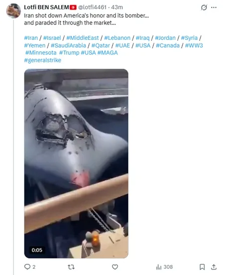Une quatrième vidéo prétend montrer un bombardier américain abattu par l’Iran puis exposé publiquement dans un marché. Cette séquence spectaculaire, largement relayée sur plusieurs plateformes, n’est confirmée par aucune source militaire ni par aucun média spécialisé dans le suivi des opérations aériennes. Les images comportent également des incohérences visuelles, notamment dans les proportions de l’appareil et les mouvements de foule, qui suggèrent une fabrication numérique.