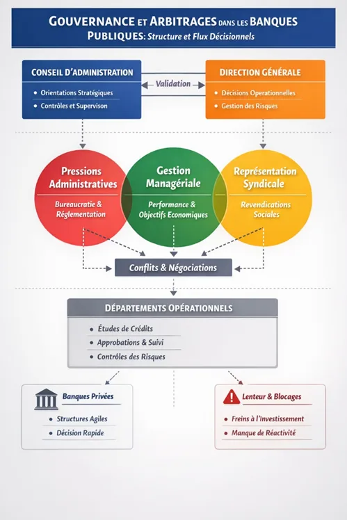 Pour illustrer l’effet de la gouvernance sur la réactivité, on peut observer que dans certaines banques privées, les décisions économiques sont souvent prises plus rapidement, grâce à des structures organisationnelles plus compactes et des circuits décisionnels moins fragmentés. Cette comparaison n’est pas un jugement de valeur : elle montre simplement que la clarté des responsabilités et la simplification des arbitrages permettent une plus grande agilité opérationnelle, ce qui peut inspirer certaines réformes dans le secteur public.