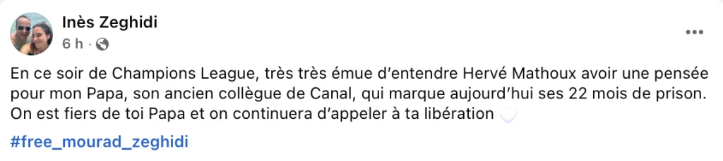 « En ce soir de Champions League, très très émue d’entendre Hervé Mathoux avoir une pensée pour mon Papa, son ancien collègue de Canal, qui marque aujourd’hui ses 22 mois de prison. On est fiers de toi Papa et on continuera d’appeler à ta libération », a-t-elle écrit.